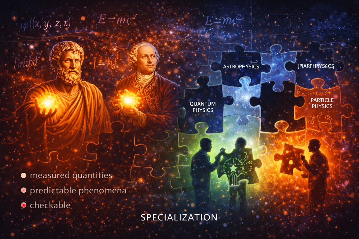У Михаил Ломоносов наука ещё сохраняла целостность: природа рассматривалась как связная система. Дальше произошло неизбежное. Рост объёма знаний сделал невозможным удержание всей картины одним человеком. Математика стала универсальным языком, который позволил: Так родилась специализация. Физика не распалась из-за ошибки.