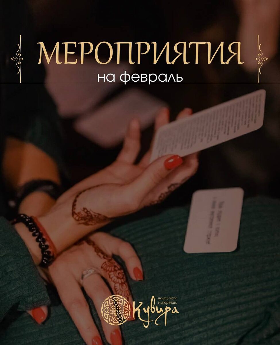 ? — в Кувиру на мероприятия 👇🏻 6 февраля ПТ ▫️18:00 — Медитация «Ом Чантинг» Древняя практика пения мантры «ОМ», соединяющая тело, ум и душу. Успокаивает, пробуждает внутреннюю энергию и восстанавливает баланс. |Преподаватель: Самойлова Гала 7 февраля СБ ▫️13:00 — Игра «Лила» Игра «Лила» — это древняя практика самопознания. Она помогает увидеть, где вы застряли, что мешает двигаться дальше и куда сейчас важно направить внимание. |Ведет: Наталья Гончарова 8 февраля ВС ▫️13:00 — Астрологический мастер-класс: «Любовь и кармические партнеры» Этот мастер-класс — про понимание себя в отношениях. Вы узнаете, какую роль проживаете в паре, сколько по судьбе кармических союзов, как проявляетесь эмоционально и куда ведёт ваш путь в любви. |Ведет — Хаткина Ольга ▫️13:00 — Медитация «Ом Чантинг» Древняя практика пения мантры «ОМ», соединяющая тело, ум и душу. Успокаивает, пробуждает внутреннюю энергию и восстанавливает баланс. |Преподаватель: Самойлова Гала 15 февраля ВС ▫️14:00 — Звуковая ме