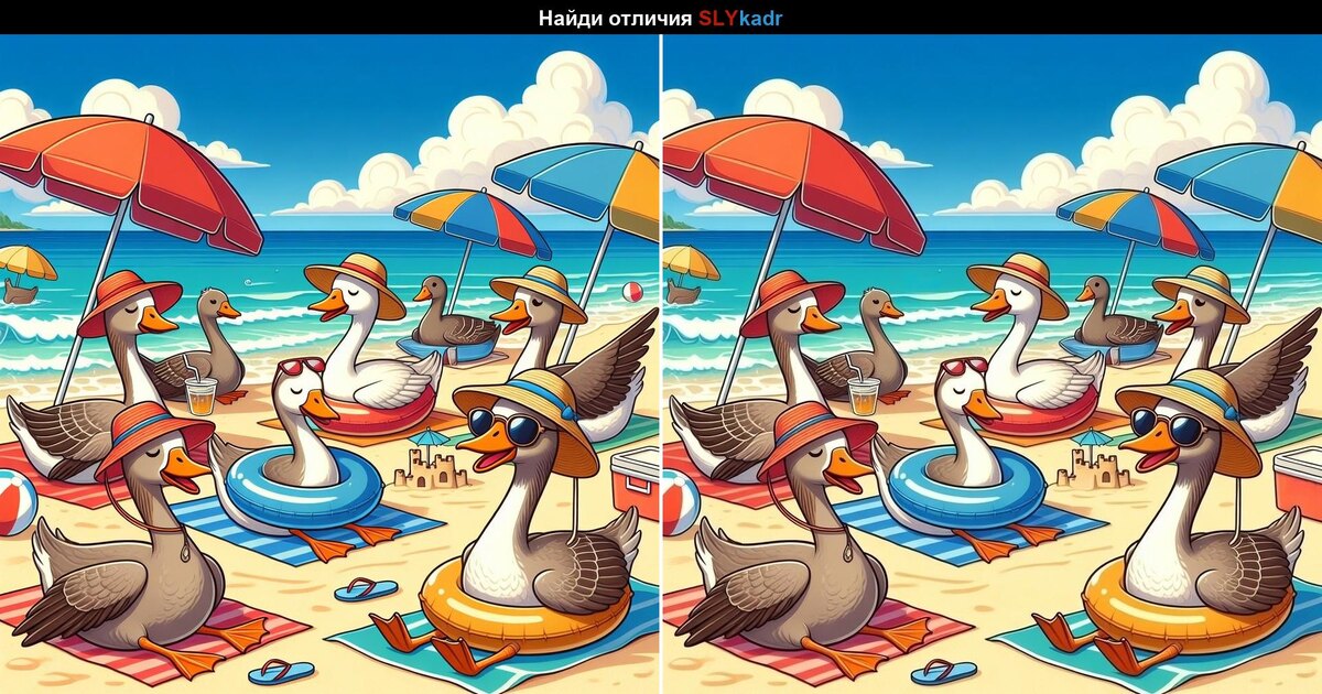 Гуси тоже решили взять отпуск и устроили настоящий пляжный отдых. Но не всё так просто… Перед вами две почти одинаковые картинки. Сможете ли вы найти все отличия и не упустить ни одной хитрой детали? 😉 Смотрите внимательно — пернатые любят маскироваться! Ну что, получилось найти все отличия? 🧐
