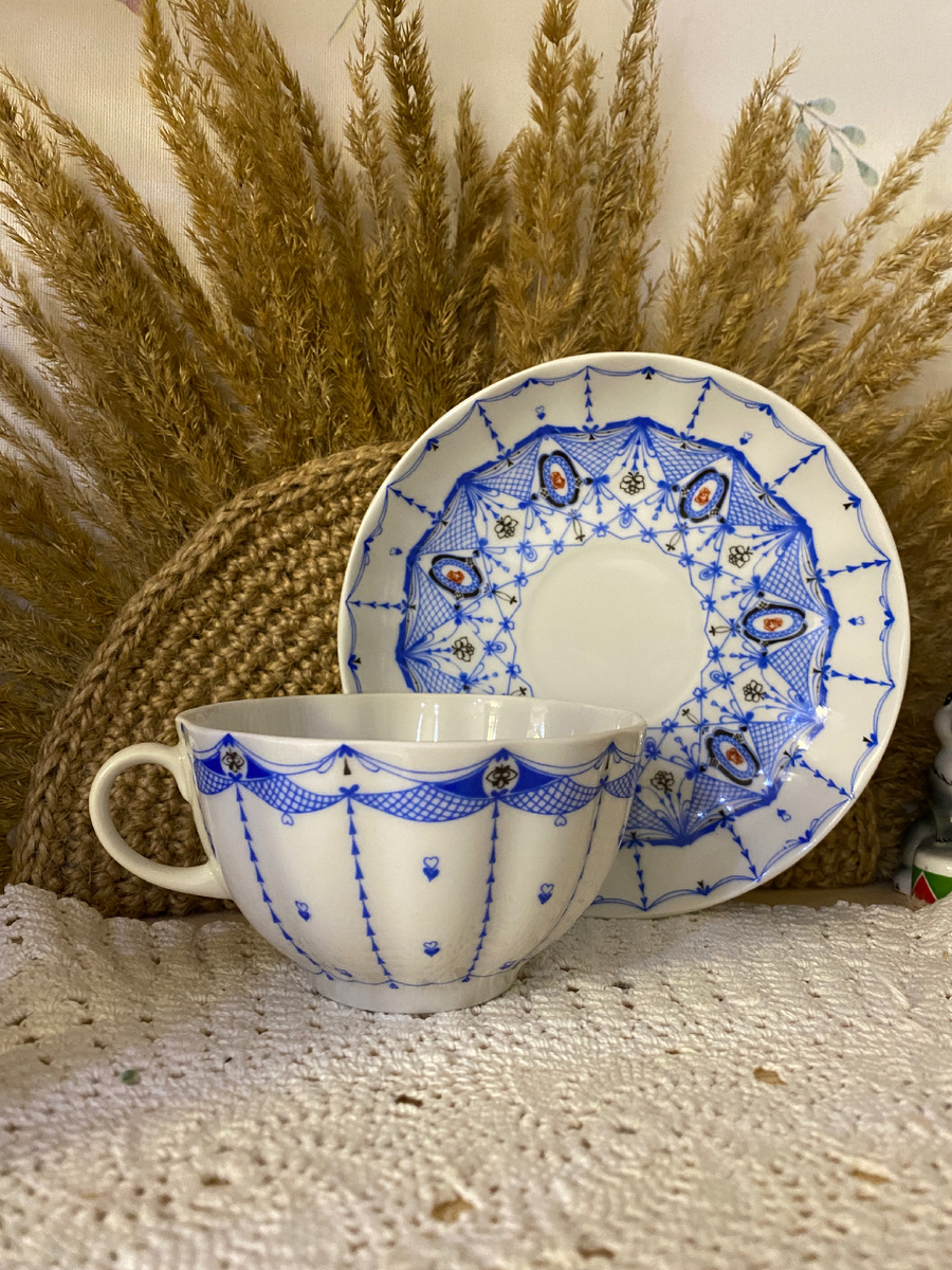 Необычная и, я бы сказала, несвойственная этому заводу, форма в стиле рококо. Ножка с волнистым основанием, чаша юбочкой, сложносочинненная элегантная ручка и сам рисунок - смотришь и не веришь, что это дулевский фарфор.