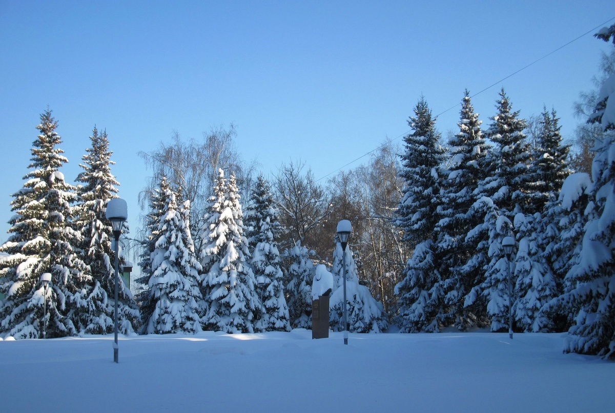 Сквер у бюста лётчика-космонавта, дважды Героя СССР Валерия Кубасова в солнечный февральский день. Фото 03.02.2026