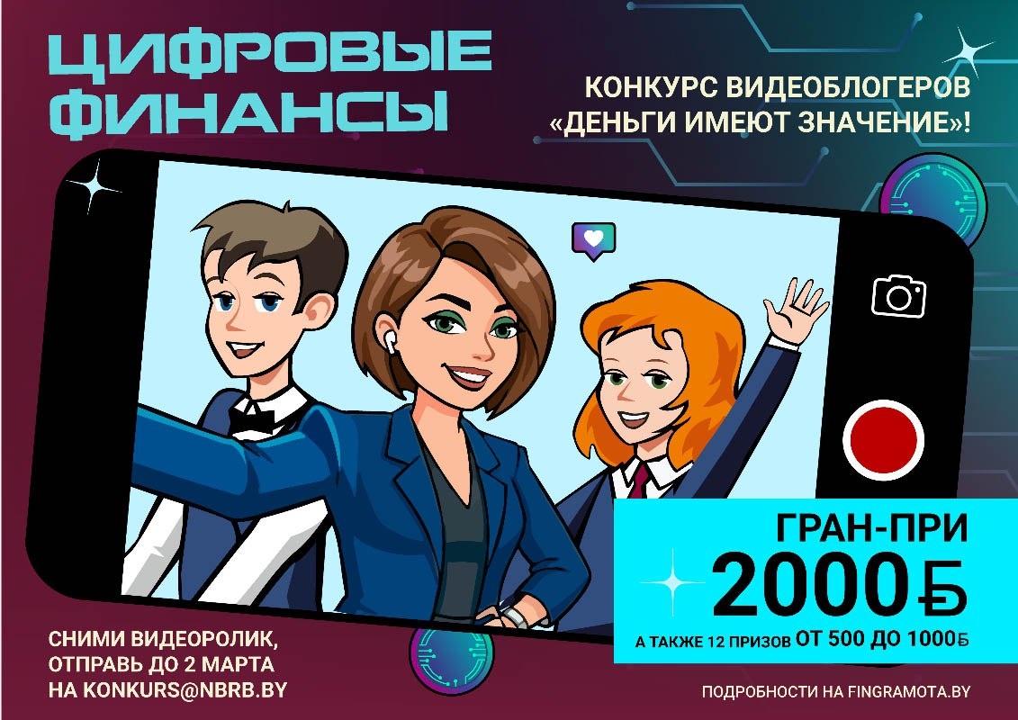 ». 👉 Конкурс традиционно приурочен к Неделе финансовой грамотности детей и молодежи, которая в этом году пройдет в Беларуси с 16 по 22 марта. ✔️ Темой недели и конкурса видеоблогеров в 2026 году стали цифровые финансы. 📌 В конкурсе могут принять участие молодые люди в возрасте от 7 лет до 31 года (как индивидуально, так и в составе коллективов). ⭐️ Жюри конкурса выберет работу, которая получит Гран-при — денежную премию в размере 2 тыс. бел. руб. Кроме того, будет разыграно еще 12 наград в четырех номинациях. Победитель в каждой номинации получит денежную премию в размере 1 тыс. бел. руб., номинанты — по 500 бел. руб. ➡️ Подробнее о конкурсе — на нашем САЙТЕ.