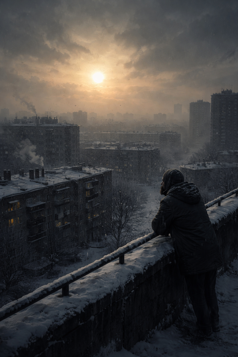 Над тощими хребтами крыш зима,