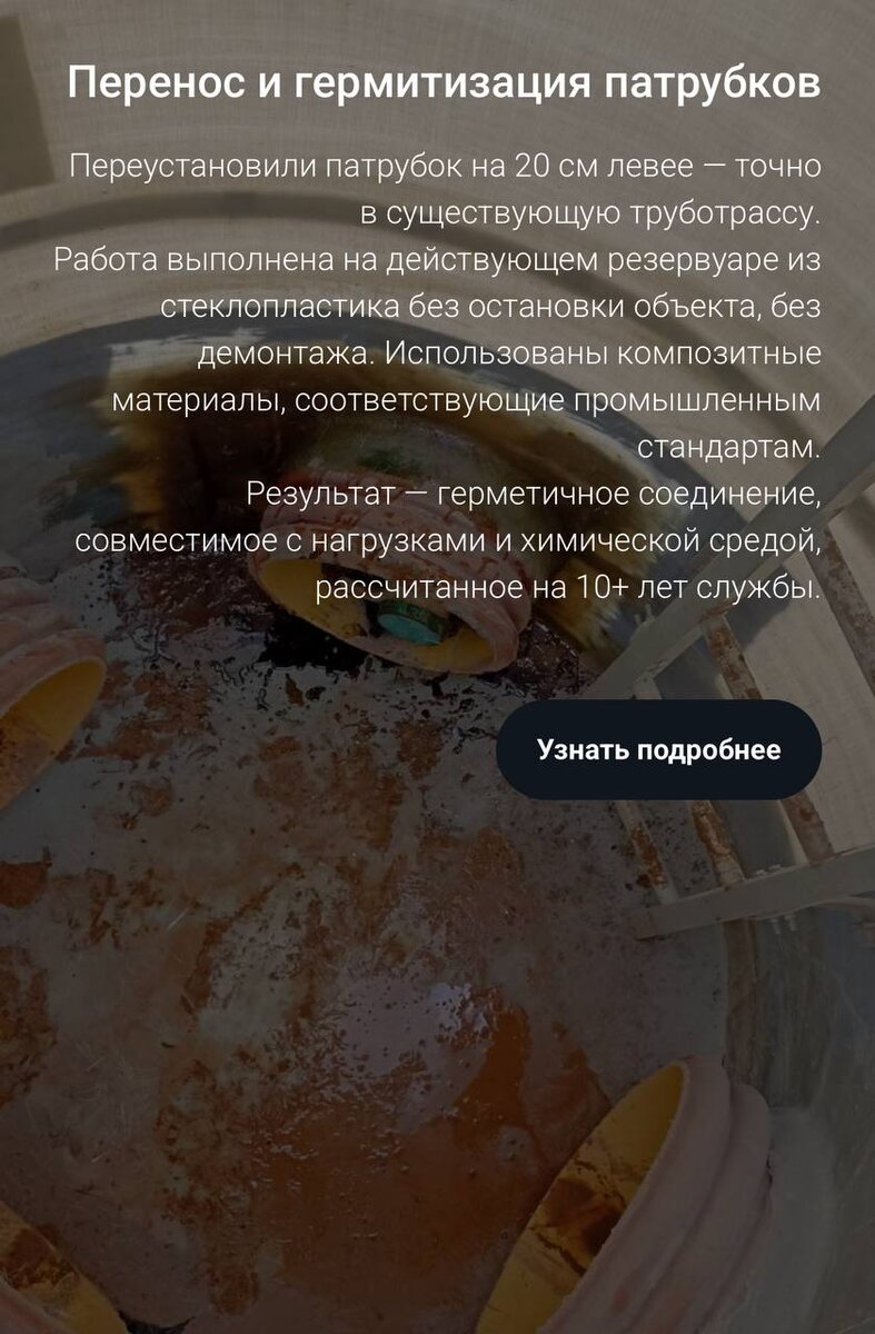 Работа выполнена на действующем резервуаре из стеклопластика без остановки объекта, без демонтажа и сварки. Использованы композитные материалы, соответствующие промышленным стандартам. Результат — герметичное соединение, совместимое с нагрузками и химической средой, рассчитанное на 10+ лет службы. Точность — по чертежам. Надёжность — по опыту. Гарантия — по договору. #SORENSON #ПереносПатрубков #РемонтРезервуаров #Стеклопластик #Труботрасса #КНС #ЛОС #КОС #РемонтБезОстановки