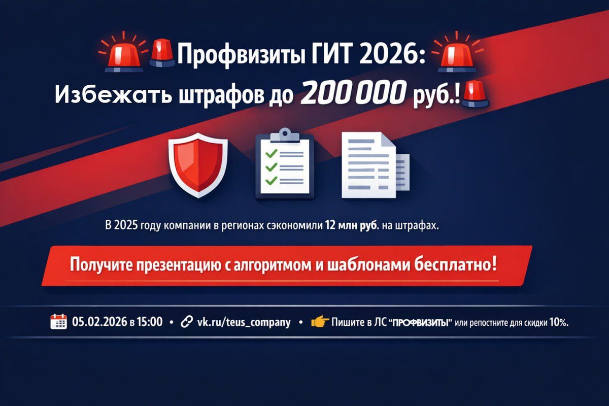 ! 🚨 Уважаемые руководители компаний, начальники отделов по охране труда и специалисты! ⚡️В 2026 году плановые проверки заменены обязательными профвизитами — это шанс на бесплатную консультацию вместо штрафов. ⚠️Не ждите "приглашения" от ГИТ: узнайте категорию риска и подготовьтесь заранее. ❗️ВЕБИНАР "Профилактические визиты 2026"❗️Трансляция на нашем втором канале - https://vk.ru/club233600009 ☄️Практический разбор для вашего бизнеса: • Категории риска и как снизить свою. • Пошаговый алгоритм: от самооценки до акта визита • Образцы заявлений на замену проверки профвизитом • Чек-лист инспектора и топ-ошибки 2025 года ⁉️Почему это выгодно: В 2025 году в Севастополе, Крыму и регионах компании сэкономили 12 млн руб. на штрафах (130 000 руб. за обучение, 200 000 за СОУТ). Получите презентацию с алгоритмом и шаблонами бесплатно! 📅 Дата и время: 05.02.2026 в 15.30✅ 📎 https://vk.ru/club233600009 👉 Пишите в ЛС "ПРОФВИЗИТ" или репостните для скидки 10% на услуги по охране тру
