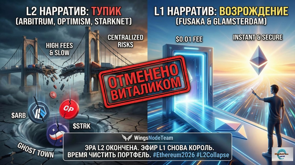 Виталик Бутерин меняет правила игры: Что ждет Ethereum в 2026? Тема: Фундаментальный сдвиг в экосистеме Ethereum и конец нарратива "L2 спасут мир". 😀 Введение: Гром среди ясного неба Вчера Виталик Бутерин опубликовал лонгрид, который можно смело назвать "похоронами старого L2-нарратива". То, что годами продавали нам как будущее масштабируемости (Arbitrum, Optimism, Starknet), теперь официально признано тупиковой ветвью эволюции в её текущем виде. Главный архитектор Ethereum заявил прямо: концепция L2 как "брендированных шардов" больше не работает. 😀 Почему Виталик "убил" L2? (Анализ тезисов) В 2020 году нам сказали: "Эфир будет медленным, всё уйдёт в L2". В 2026 году реальность изменилась. 😀 L1 победил L2 в их же игре 😀Скорость и Дешевизна: После обновлений Fusaka (декабрь 2025) и грядущего Glamsterdam (2026), сам базовый слой Ethereum (L1) стал невероятно быстрым и дешевым. 😀Факт: Средняя комиссия в L1 упала до $0.44 (а ночью - до $0.01). 😀Вопрос: Зачем пользователю му
