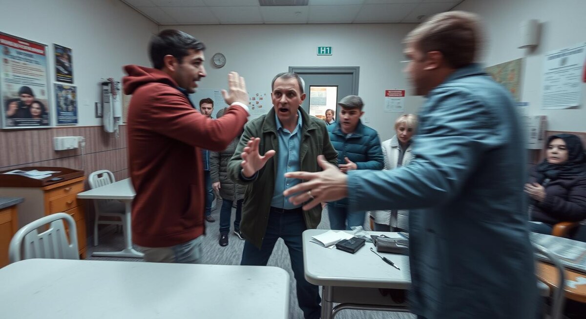 «Сначала это был просто громкий разговор, — вспоминает мужчина из очереди. — Он требовал “срочно, сейчас, без бумажек”, потом ударил ладонью по стойке регистратуры, опрокинул пластиковый стул и пошел к кабинету с ключом “только для персонала”». По словам медсестры, мужчина резко распахнул дверь, начал требовать других специалистов и «жалобную книгу». Когда охранник и пациенты попытались его успокоить, он повысил голос: «Вы меня запугиваете? Да я сидеть в тюрьме не боюсь!» На полу оказалась перевернутая урна, разлит антисептик, дети плакали, одна женщина попыталась увести своего малыша подальше, прикрывая ему уши курткой.