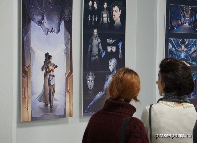 Выставочный зал увешан множеством планшетов, каждый из которых представляет так называемый концепт-арт к игровым проектам, то есть основные части вплоть до мелких элементов: внешний облик персонажей, включая одежду и аксессуары, фоны и пейзажи окружающей среды, в которой разворачивается всё действие, дизайн конкретных локаций, техники, оружия, приборов, иных предметов.