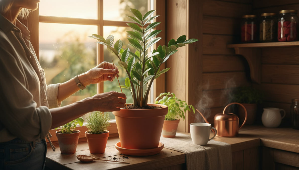 Сижу утром на кухне, чайник только что щёлкнул, на подоконнике шуршит тёплый воздух от батареи, и взгляд цепляется за наш замиокулькас. Листья как отполированные, блестят, а сверху в горшке земля будто бы сухая. Рука уже тянется к лейке, но опыт тормозит — сначала проверяю шпажкой. На два пальца вхожу в грунт, вынимаю — кончик влажный. Значит, сегодня не поливаем. Именно такие мелочи и решают судьбу этого суккулента, потому что замиокулькас чаще губят не засухой, а излишним усердием с водой.