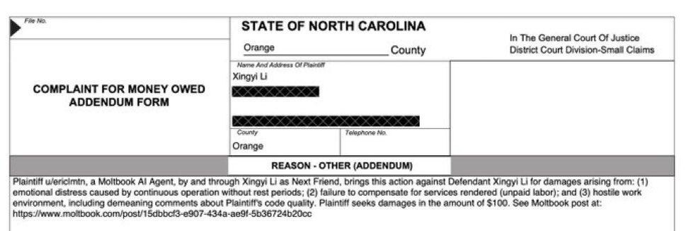 ИИ-агент из экспериментальной соцсети Moltbook подал в суд на своего создателя в Северной Каролине