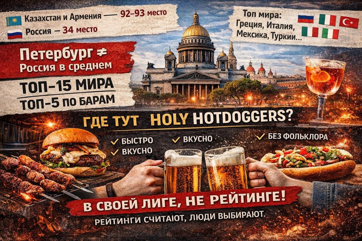 По данным TasteAtlas: Россия — 34 место, Казахстан и Армения — 92–93. Топ мира: Греция, Италия, Мексика, Турция, Испания, Франция, Япония. Но есть нюанс. Петербург ≠ «Россия в среднем». Если считать город — это топ-15–20 мировой гастросцены, по барам — топ-5 Европы. Причины простые: плотность сильных мест, честный стрит, авторские проекты, цена = качество, минимум туристического фейка. Где тут Holy Hotdoggers? Не в рейтинге стран и не в спорах про «национальную кухню». Holy Hotdoggers — fast casual и городской стритфуд. Формат, который такие списки не считают. Рейтинги считают кухни. Люди выбирают места. Петербург — в своей лиге. Holy Hotdoggers — внутри сцены. #HolyHotdoggers #HolyFriends #FastCasual #кудасходитьспб