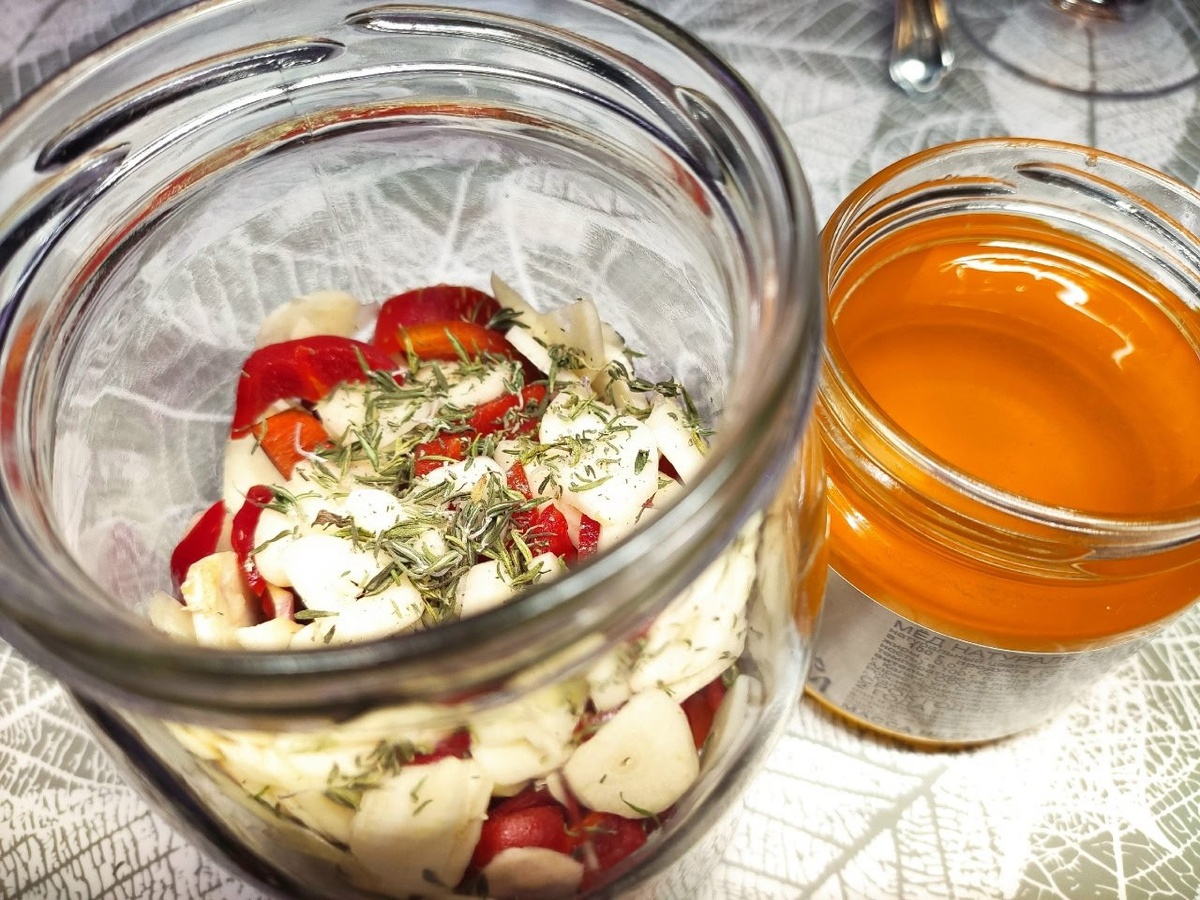Острый перец, чеснок, приправы и мёд.Ингредиенты для острого сливочного масла готовы!