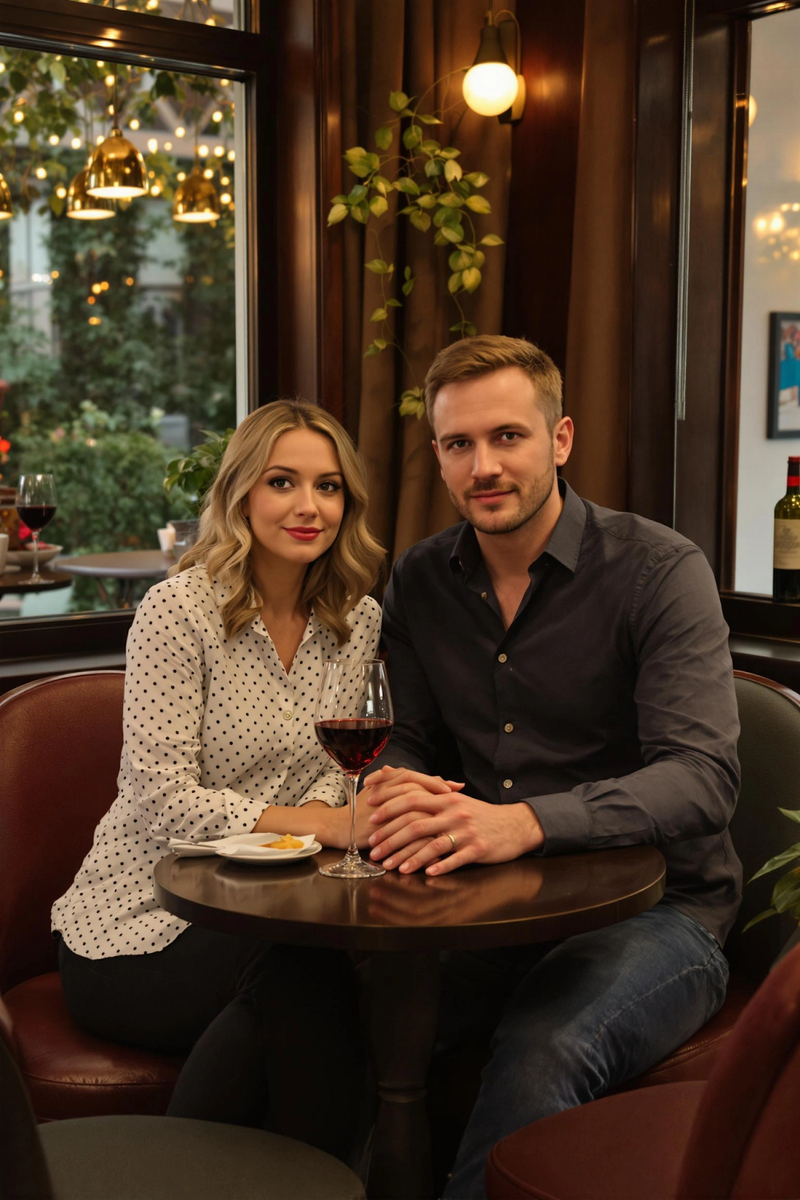 Пара сидит рядом за столиком в небольшом кафе во время вечерней прогулки, между людьми минимальная дистанция, один человек слегка наклонён в сторону другого, плечи почти соприкасаются, взгляды направлены в разные стороны, крупный план, эквивалент 85mm, тёплый рассеянный свет, мягко размытый фон, ощущение спокойного личного момента и близкого присутствия.
