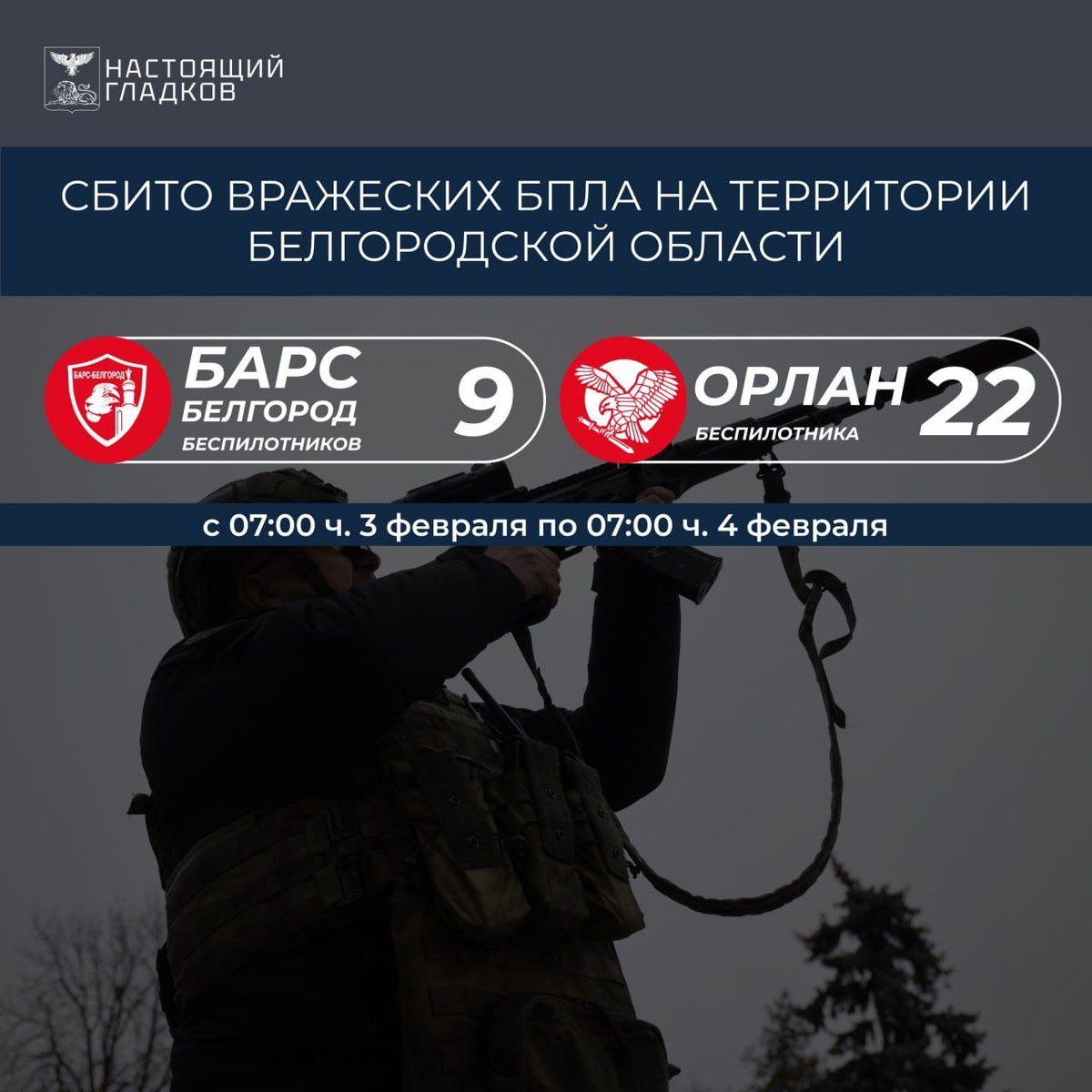 » С 07:00 ч. 3 февраля по 07:00 ч. 4 февраля ликвидирован 31 беспилотник «БАРС-Белгород» — 9 беспилотников:** 📍подавлены РЭБ: — Шебекинский округ: 6 FPV-дронов. 📍 сбиты из стрелкового оружия: — Валуйский округ: 2 FPV-дрона; — Шебекинский округ: 1 FPV-дрон. **«Орлан» — 22 беспилотника: ** 📍подавлены РЭБ: — Белгородский округ: 3 FPV-дрона; — Валуйский округ: 1 FPV-дрон; — Волоконовский округ: 1 FPV-дрон. 📍 сбиты из стрелкового оружия: — Белгородский округ: 1 FPV-дрон; — Борисовский округ: 6 FPV-дронов; — Волоконовский округ: 2 БПЛА самолётного типа с ДВС; — Грайворонский округ: 1 FPV-дрон; — Краснояружский округ: 1 БПЛА самолётного типа; — Шебекинский округ: 2 FPV-дрона и 1 БПЛА типа «Дартс». 📍 подавлены РЭБ совместными усилиями подразделения «ОРЛАН» и бойцов самообороны: — Шебекинский округ: 2 FPV-дрона; — Белгородский округ: 1 FPV-дрон. Благодарю всех бойцов за эффективную