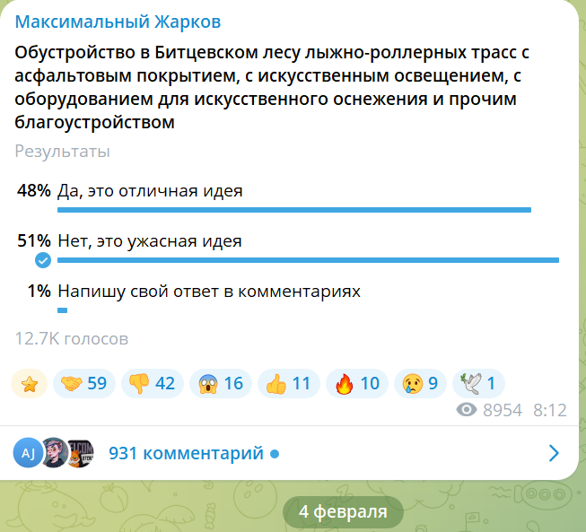 И вот тут депутат Жарков публикует тот самый совсем невинный опрос. И что происходит? Так, мимолётно, проголосовало там от силы человек сто. Все против биатлонных трасс. И вдруг, буквально за десять минут, число голосующих достигло порядка пяти тысяч. И все они голосовали за Проект.