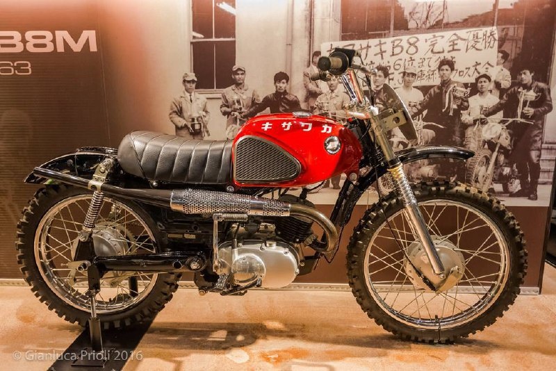 Первый серийный мотоцикл Kawasaki впервые был представлен публике в 1962 году, а продажи стартовали годом позднее, в 1963 году - это был Kawasaki B8 с двухтактным двигателем объемом 125 см³. Именно этот мотоцикл стал точкой отсчета мотоциклетной истории бренда, который позже будет ассоциироваться со скоростью, агрессией и инженерной дерзостью. Уже на старте Kawasaki выбрала сложный путь: B8 получил поворотный дисковый клапан - редкую для начала 1960-х технологию впуска, позволявшую точнее контролировать подачу топливной смеси и снимать большую мощность с малого объема двухтактного двигателя. Отдельную роль сыграла спортивная версия B8M, известная под прозвищем Red Tank из-за красного топливного бака. Именно она активно участвовала в японских гонках и принесла Kawasaki первые победы, сформировав репутацию марки как ориентированной не на утилитарные мотоциклы, а на спорт и технологии. Уже в своем первом мотоцикле Kawasaki показала характер: вместо простоты - инженерия, вместо компромиссо