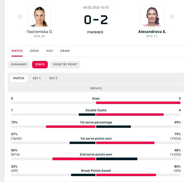 ⚡ Александрова выносит Ястремскую во втором круге турнира в Абу-Даби со счетом 6-3, 6-0.