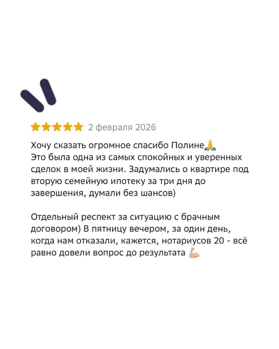 ⭐️⭐️⭐️⭐️⭐️ Нашему эксперту Полине Все потому что мы решаем любые задачи клиентов оперативно и эффективно, обеспечивая комфорт и надежность на каждом этапе! 🙌🏻 И наши услуги без комиссии. Клиент обратился 30.01 с задачей получить вторую семейную ипотеку с брачным договором. Нам было важно! Успеть купить новостройку до изменений в программе и обеспечить юридически правильное оформление сделки. Сложность была на каждом этапе, и вот что сделала наша команда: • Полина подобрала квартиру и быстро нашла надежного нотариуса для составления брачного договора • Никита организовал ускоренное получение одобрения ипотеки в Сбербанке • Провели сделку в субботу, несмотря на большую очередь и ограниченность сроков Мы успели 🔥 А наш клиент сразу получил ключи от квартиры стоимостью 6 млн.₽, оформив выгодную ипотеку всего за неделю. — Ежемесячные платежи составили 35 000₽/мес. ДЛЯ КОНСУЛЬТАЦИИ ЧАТ-БОТ