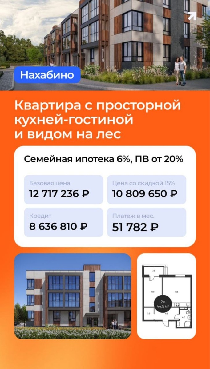 💭 2Еккв. 45.95 м² с видом на лес Базовая стоимость: 12 717 236 руб. Стоимость со скидкой 15%: 10 809 650 руб. Квартира доступна по Семейной ипотеке. Пример расчета в карточке.