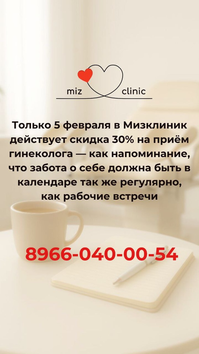 Женское здоровье начинается с регулярной профилактики, а не с появления симптомов. Приём гинеколога — это возможность вовремя выявить изменения, оценить гормональный баланс и состояние репродуктивной системы, получить персональные рекомендации врача. Только 5 февраля в Мизклиник действует скидка 30% на приём гинеколога — как напоминание, что забота о себе должна быть в календаре так же регулярно, как рабочие встречи. Иногда лучший шаг для себя — просто прийти на приём. 📍 Москва, ул. Правды, 2А 📞 8 966-040-00-54