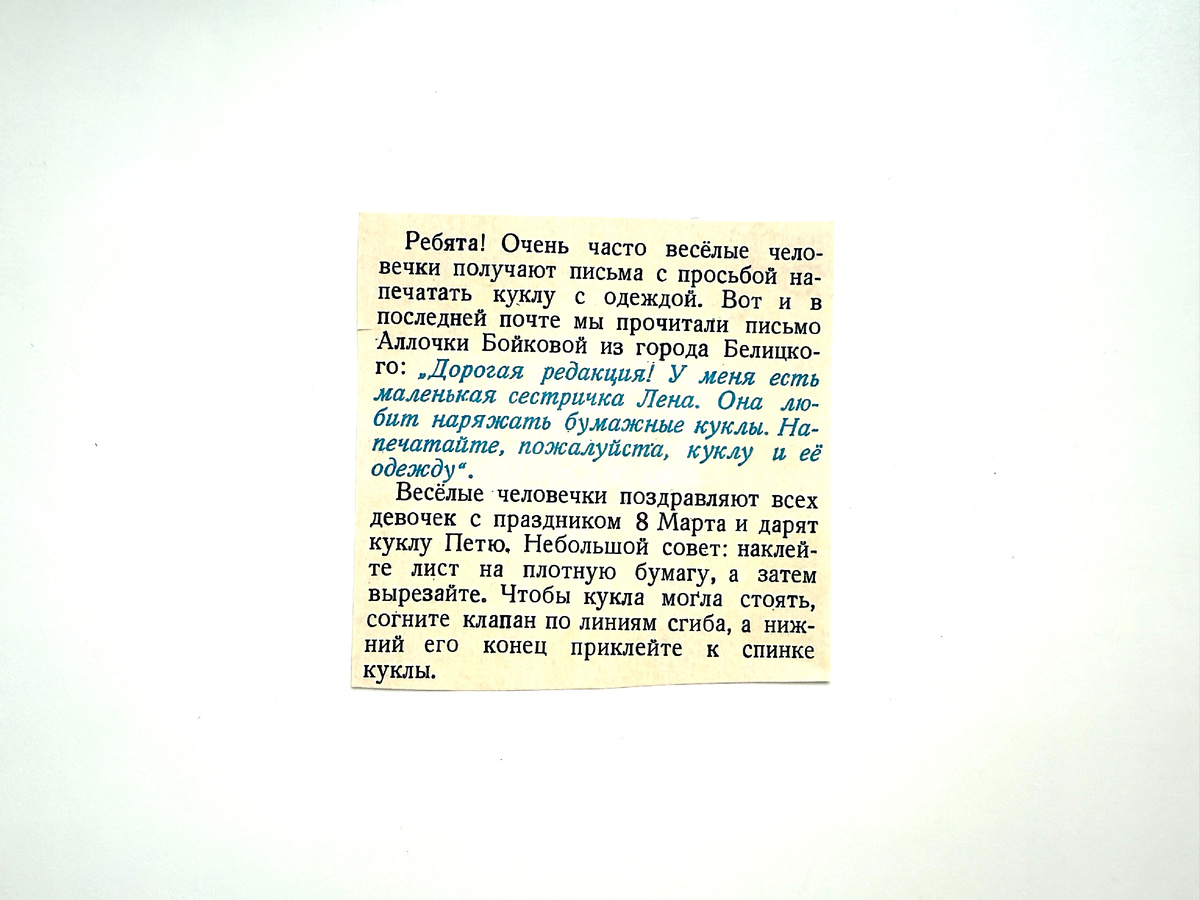 Куколок в журналах часто печатали по просьбам читателей. Сегодняшняя куколка как раз пример такого обращения: Мне в таких случаях всегда интересно, где сейчас автор этого письма? Помнит ли он про него? А где та самая Лена? Сохранилась ли у неё куколка, напечатанная специально для неё в общесоюзном журнале? Куколка, кстати, очень симпатичная, вот, смотрите: Куколка именная, её зовут Катя. Интересная у неё поза, она как будто бы и приветствует свою будущую "маму", мол, "добро пожаловать", и в то же время готовится её обнять: Нарисовала куколку художник Татьяна Зуйкова. Гардероб у Катюшки для своего времени отменный, как мне кажется: Правда, одёжки не всегда подходят по размеру, или же надо вырезать Катю не по контуру, а срезать чуть больше: А ещё у неё есть как раздельные одёжки, которые можно комбинировать, так и сдельные: Мне кажется, гардероб у Кати не просто хороший, но даже богатый. Вроде как в 70-е это джинсовые вещи были ого-го какой дефицит. А у неё вон и жилет, и вот, джинсы: А