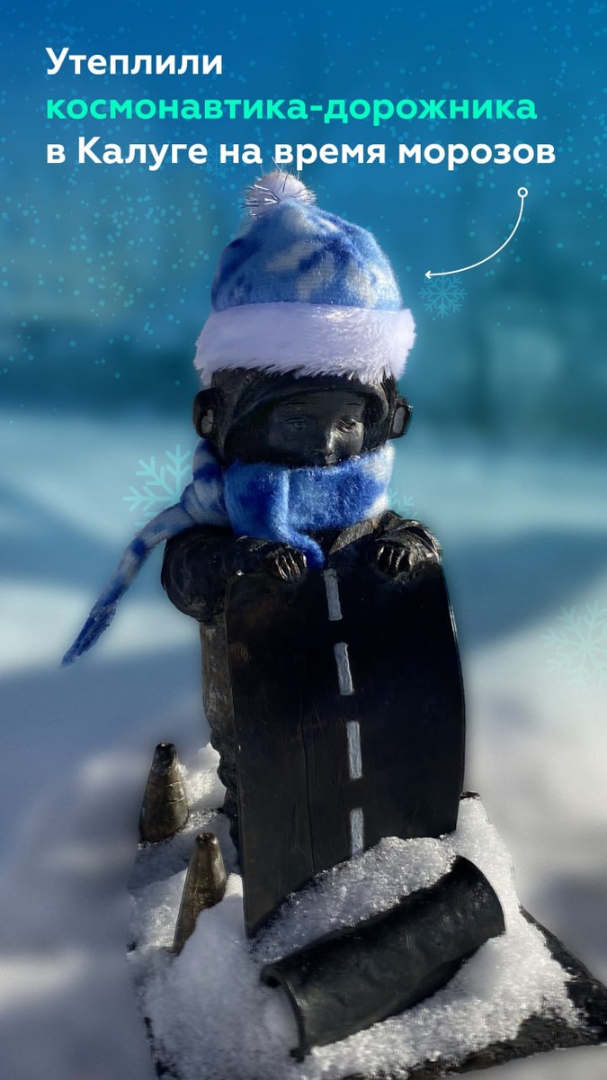 😎 Каждую зиму космонавтик в светоотражающем жилете «утепляется». В этом году он успел сменить три образа, неизменно поднимая настроение местным жителям и туристам. Милую скульптуру установили в 2023-м, ко Дню работников дорожного хозяйства. Мы подарили её городу и расположили у памятника 600-летия Калуги. Всего в региональном центре можно найти 34 космонавтика. Традиция одевать памятники сложилась во многих городах страны. Так, в этом году томичи нарядили памятник Татьяне в День студента, а в Ярославле были украшены небольшие скульптуры медведей, расположенных в разных уголках города.