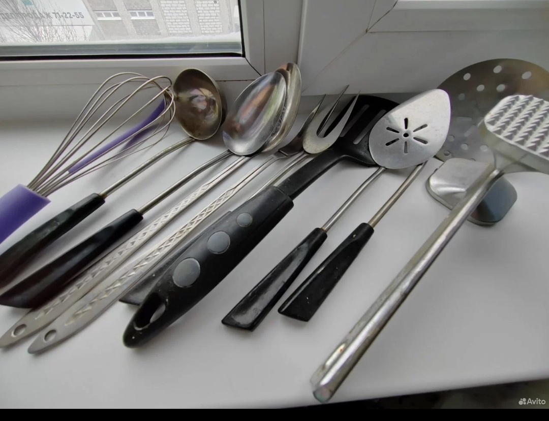 Купили ещё под конец января вот такой набор кухонных принадлежностей пакетом за 310 рублей. Есть и новые принадлежности, и старые времён СССР.