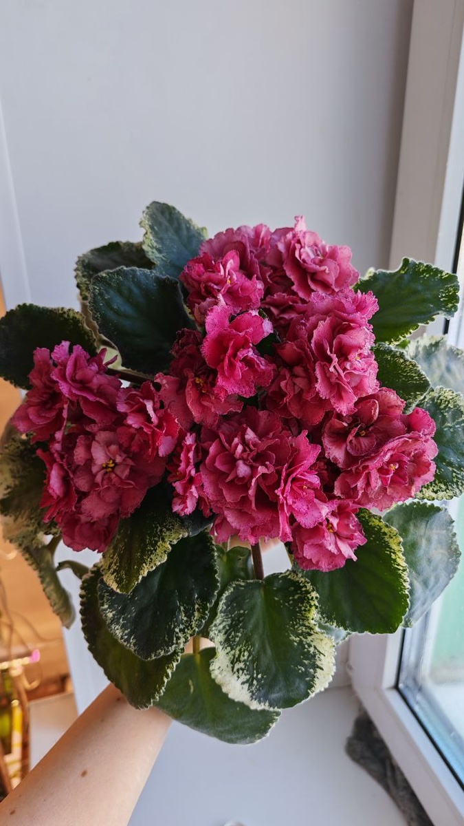 ! Периодически девочки спрашивают: "А какой у Вас с мамой самый любимый сорт фиалок?". Нам крайне сложно ответить на этот вопрос, ведь на ум приходят сразу десятки любимейших красавиц-фиалочек. Однако, есть те гибриды, которые, действительно, приходят на ум первыми в этом списке любимчиков. Перед вами прекраснейший сеянец Константина Морева СМ-Коричная Роза с красивейшей пестролистной розеткой и шикарными махровыми цветами-розами нежного розово-красного оттенка с удивительной каемочкой-крапом по краю лепестков. Этому растению уже более трёх лет, однако, даже стартерчики выглядят очень достойно и с юности набирают шапку за шапкой!