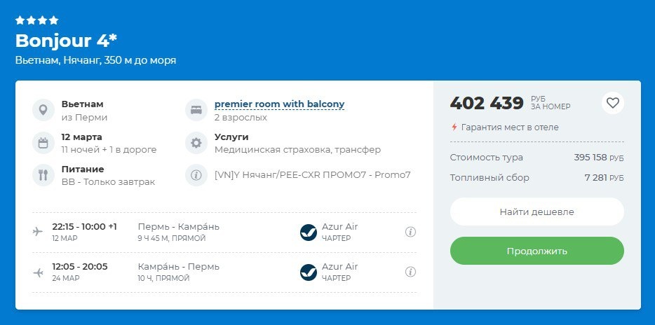 Например, за 11 ночей в отеле Bonjour 4* (Нячанг) пермским туристам придется выложить 402 тыс. руб. на двоих, если вылетать из родного города, а из столицы Урала – лишь 258 тыс. По другим популярным гостиницам картина похожая. О причинах такой ценовой разницы написали на ТурДоме. Кстати, еще 3 месяца назад тарифы на туры во Вьетнам из Перми были едва ли не вдвое ниже. @tourdom