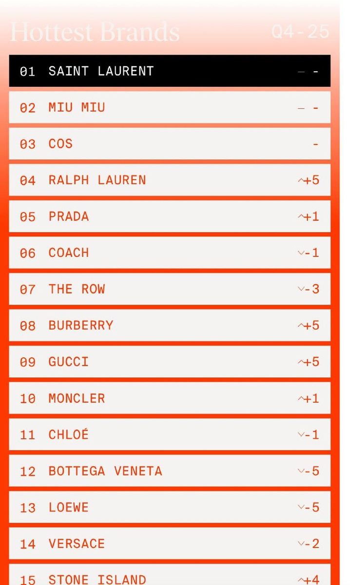 чётким кодом и понятной одеждой. COS удерживает третье место (+60% спроса), растут Massimo Dutti и Ralph Lauren (+24% и вирусная «рождественская эстетика»), а также Burberry, Gucci и Stone Island — все выигрывают за счёт сильной идентичности. Падают те, у кого концепция после изменений ещё не закрепилась. Главный тренд — «современная классика» и практичность: верхняя одежда, трикотаж, простые аксессуары. Хит квартала — quarter-zip свитер Polo Ralph Lauren (+132% поисков).