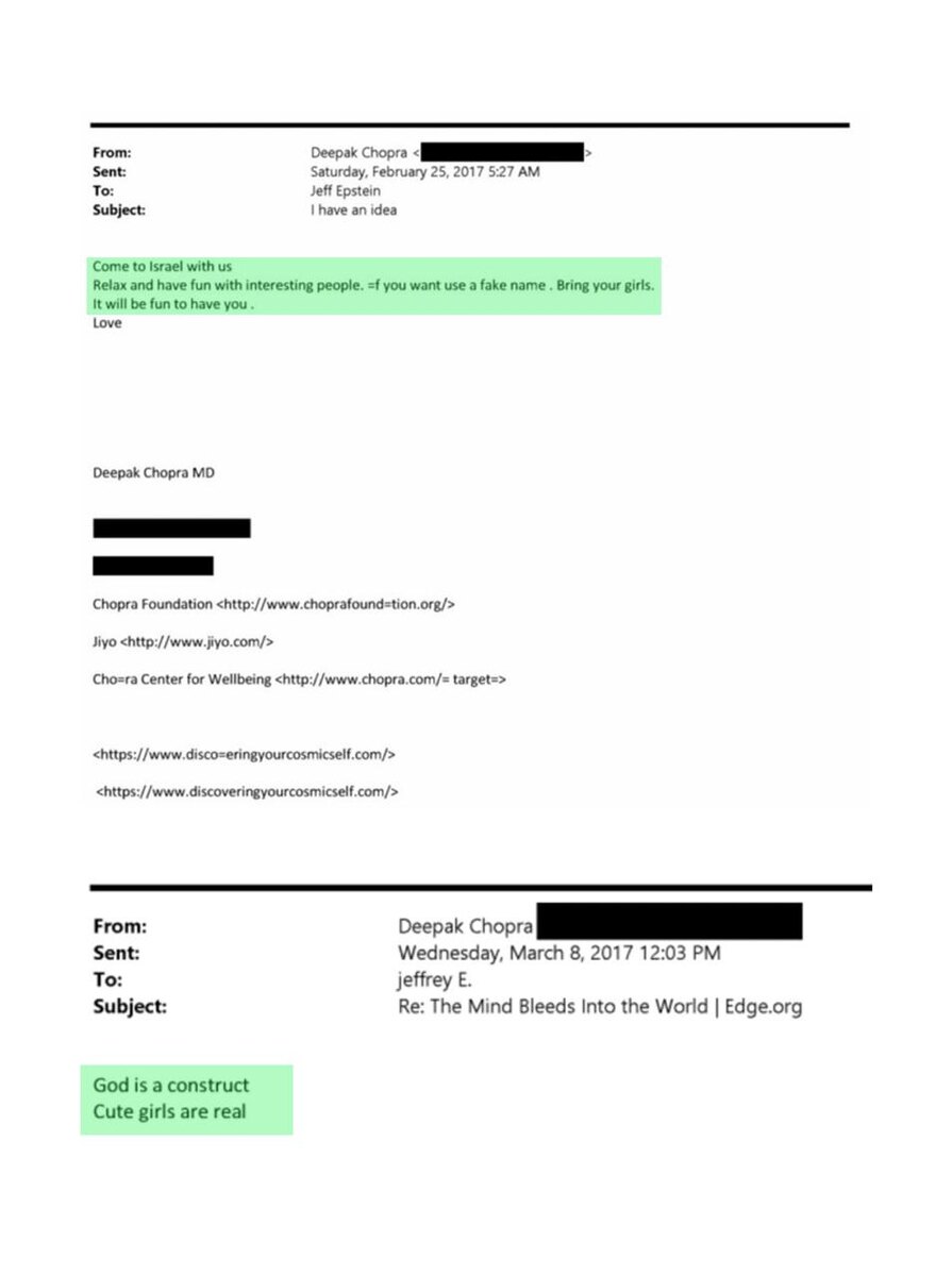 ‘Bring your girls’ — Deepak Chopra to Epstein ‘Come to Israel with us. Relax and have fun with interesting people. If you want use a fake name’ ‘God is a construct Cute girls are real’ What kind of spirituality is that?