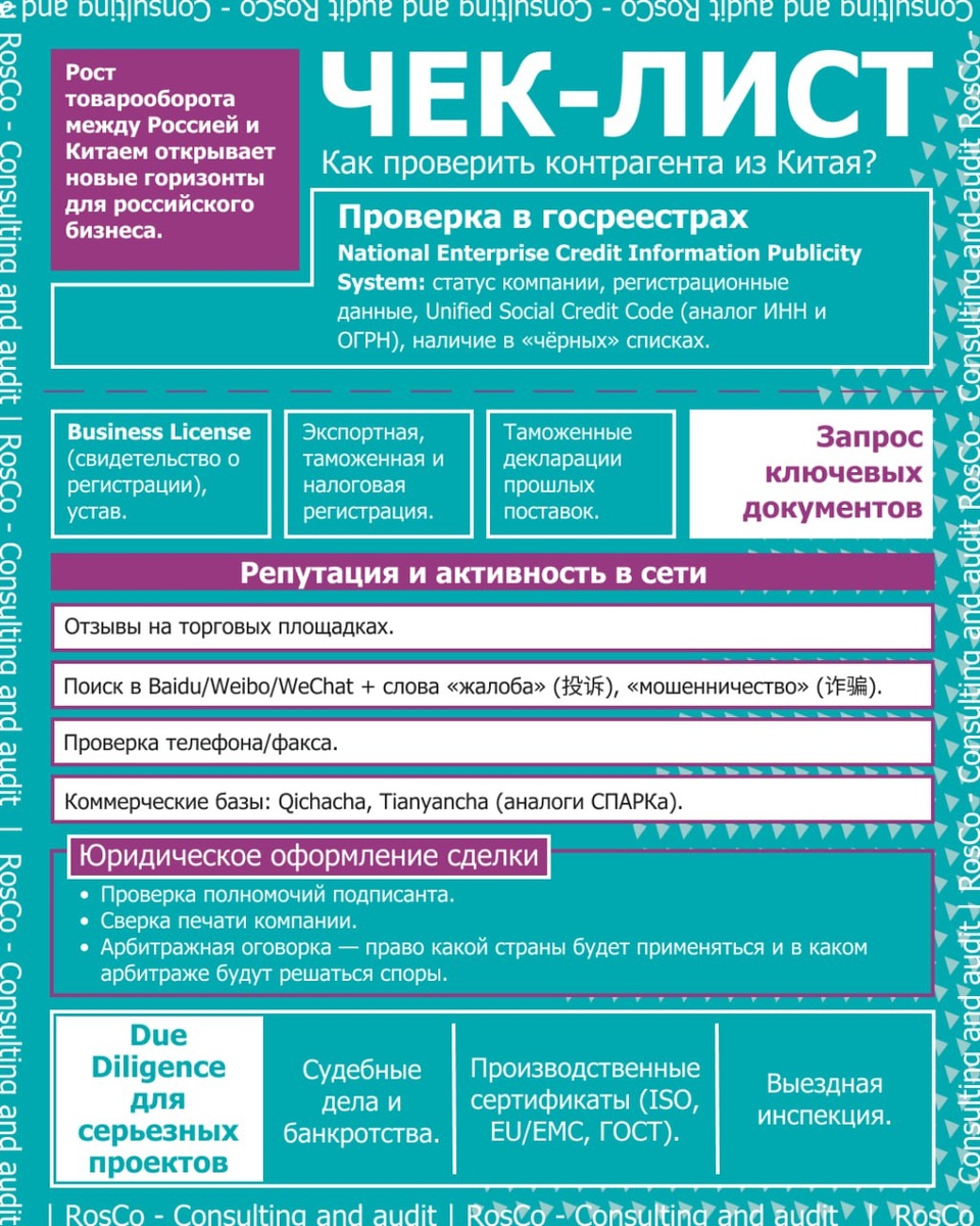 Рост товарооборота между Россией и Китаем открывает новые горизонты для российского бизнеса. 1️⃣— Проверка в госреестрах 🔸National Enterprise Credit Information Publicity System: статус компании, регистрационные данные, Unified Social Credit Code (аналог ИНН и ОГРН), наличие в «чёрных» списках. 2️⃣— Запрос ключевых документов 🔸Business License (свидетельство о регистрации), устав. 🔸Экспортная, таможенная и налоговая регистрация. 🔸Таможенные декларации прошлых поставок. 3️⃣— Репутация и активность в сети 🔸Отзывы на торговых площадках. 🔸Поиск в Baidu/Weibo/WeChat + слова «жалоба» (投诉), «мошенничество» (诈骗). 🔸Проверка телефона/факса. 🔸Коммерческие базы: Qichacha, Tianyancha (аналоги СПАРКа). 4️⃣— Due Diligence для серьезных проектов 🔸Судебные дела и банкротства. 🔸Производственные сертификаты (ISO, EU/EMC, ГОСТ). 🔸Выездная инспекция. 5️⃣— Юридическое оформление сделки 🔸Проверка полномочий подписанта. 🔸Сверка печати компании. 🔸Арбитражная оговорка — право какой стран