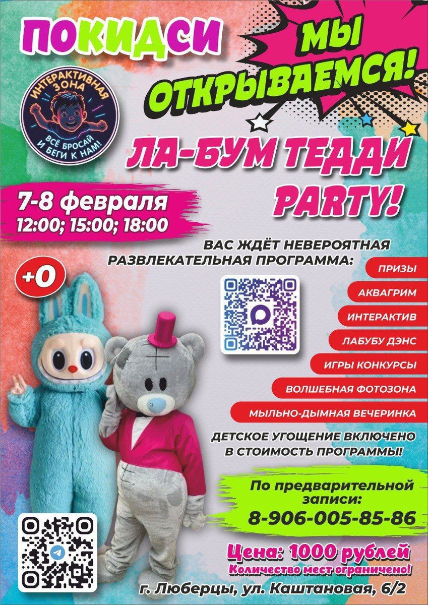 ! 🎉 ⭐️В честь открытия⭐️ интерактивной зоны 🦄"ПОКИДСИ"🦄приглашаем Вас и Ваших детей на развлекательную шоу‑программу ⚡ЛА‑БУМ ТЕДДИ PARTY! ⚡ ✅7 и 8 февраля — ✅ сеансы в 12:00, 15:00 и 18:00. 🔝Вас ждут:🔝 🛍ПРИЗЫ 🙂АКВАГРИМ 🎮Игры и конкурсы 📸Волшебная фотозона ✨Мыльно‑дымная вечеринка 🎵Лабубу‑дэнс 🍟🍔ВКУСНОЕ ДЕТСКОЕ УГОЩЕНИЕ ВКЛЮЧЕНО В СТОИМОСТЬ ПРОГРАММЫ!🍬🍴 ✈️Успейте записаться — места ограничены!⛔️ ✏️Ссылка на нашу группу в телеграм ПРИГЛАШАЙ ДРУЗЕЙ И ЗНАКОМЫХ: https://t.me/+nlSNUt4veEMwNmMy ✏️Ссылка на нашу группу в МАХ: https://max.ru/join/pr_EDix5aj11NOMFED98UMQQCFWD6BFg7fricLRD7tE