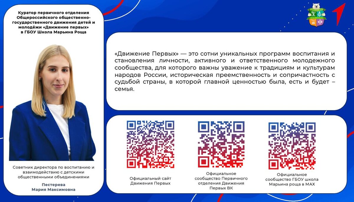 ! Куратор Первичного отделения школы Марьина роща, Мария Максимовна, рассказывает, почему важно стать частью большой команды Первых. «Движение Первых - это для тех, кто готов брать на себя ответственность и вести за собой. Кто хочет быть первым в своих идеях, делах и влиянии на будущее». Первые - это команда, которая каждый день делает дела, которые меняют жизни». Мы воспитываем в наших ребятах любовь к ближнему, к семье, к родине. Напоминаем, что команда - это люди, которые всегда подставят плечо и придут на помощь! Хочешь присоединиться? Заходи на сайт Движения Первых и вступай в наши ряды! #ШколаМарьинаРоща #ДОНМ #ШколыКолледжиМосквы #ДвижениеПервых 💌 Больше информации на нашей странице в МАХ!