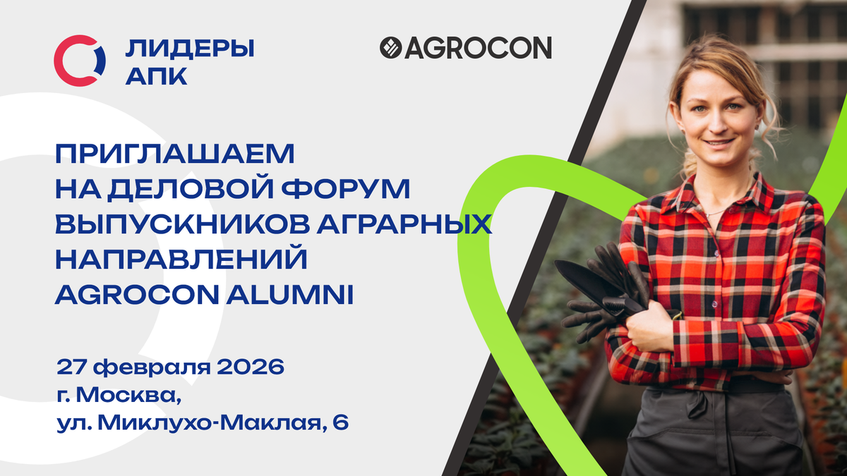 27 февраля в Москве состоится Agrocon Alumni — первый деловой форум выпускников аграрных направлений, направленный на развитие профессионального диалога и отраслевой кооперации в АПК. Проект «Лидеры АПК» выступает информационным партнёром мероприятия, разделяя его ключевые ценности: поддержку молодых специалистов, развитие кадрового потенциала отрасли и формирование устойчивого профессионального сообщества. Форум объединит выпускников аграрных направлений, представителей бизнеса, государства и экспертного сообщества для обсуждения актуальных вопросов развития агросектора — от практических компетенций и карьерных траекторий до внедрения инноваций, повышения эффективности агропроизводства и взаимодействия образования с индустрией. В деловой программе: 27 февраля, начало в 10:00 | Москва, ул. Миклухо-Маклая, 6 Регистрация открыта