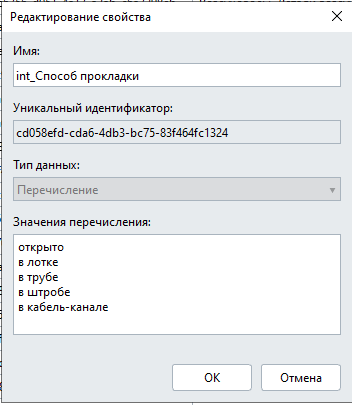 1. int_Способ прокладки кабеля, тип данных перечисление; (в перечисление сразу внесем типы прокладок, а именно: открыто, в лотке, в трубе, в штробе, в кабель-канале)