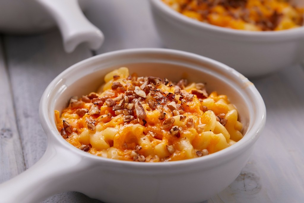 * 2,5 стакана воды * 1 стакан цельного молока * 225 г макарон-рожек * ½ чайной ложки кошерной соли * 1 стакан тертого острого сыра чеддер * 3 столовые ложки сливочного масла * 1 стакан измельченных орехов пекан * ½ стакана муки из орехов пекан Инструкции 1. Разогрейте духовку до 180 °C. 2. В кастрюле среднего размера смешайте воду, молоко, макароны и соль. Поставьте на средний огонь. Периодически помешивайте, пока жидкость не закипит, затем убавьте огонь до минимума. 3. Продолжайте готовить на медленном огне, часто помешивая, пока макароны не будут полностью готовы и жидкость не впитается, примерно 10 минут. 4. Снимите кастрюлю с огня. Добавьте половину сыра и перемешивайте, пока он полностью не расплавится. Размешайте сливочное масло и половину оставшегося сыра, оставив примерно четверть стакана для посыпки. Если консистенция кажется слишком сухой, добавьте немного горячей воды. Попробуйте и добавьте приправы по желанию. 5. Выложите макароны с сыром в форму для запекания, сверху выл