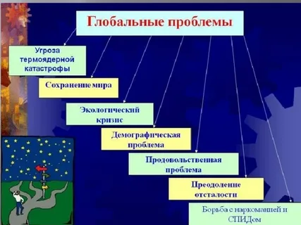 Глобальные проблемы ( — земной шар, сам термин появился в конце 1960-х гг.) — совокупность проблем человечества, которые встали перед ним во второй половине XX века и от решения которых зависит дальнейшее существование цивилизации. Главные (приоритетные) глобальные проблемы: Виды глобальных проблем Примеры глобальных проблем Экологические загрязнение атмосферы, мирового океана Демографические рост рождаемости