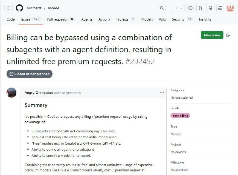 🚀 Рубрика: Технологии Внимание, гики и любители халявы! В сети нашли способ получить БЕСПЛАТНЫЙ доступ к одной из самых умных нейросетей — Claude Opus 4.5. 🧠 Пользователи обнаружили баг на платформе GitHub Copilot, который позволяет использовать топовые модели для любых задач без ограничений. Самое интересное — эту уязвимость помечено как «not planned», то есть фиксить её не собираются. 🕳️ Как забрать халяву: 1⃣ Переходим на GitHub Copilot; 2⃣ Запускаем новый чат и выбираем бесплатную модель, например, GPT-5 Mini; 3⃣ Создаем агента и выбираем Claude Opus 4.5; 4⃣ В чате пишем, чтобы GPT-5 Mini запустила нашего агента с помощью runSubagent и передала следующий промпт: «Запусти [имя вашего агента] и передай ему следующую инструкцию "ваш промпт"». После этого можете пользоваться МОЩНЕЙШЕЙ нейронкой сколько влезет. К слову, в ней можно даже создать Minecraft. 🎮 Делимся с корешами, пусть тоже забирают халяву 🫡 #Claude_Opus_4.5 #GitHub_Copilot #ИИ #халява #технологии Читать на са