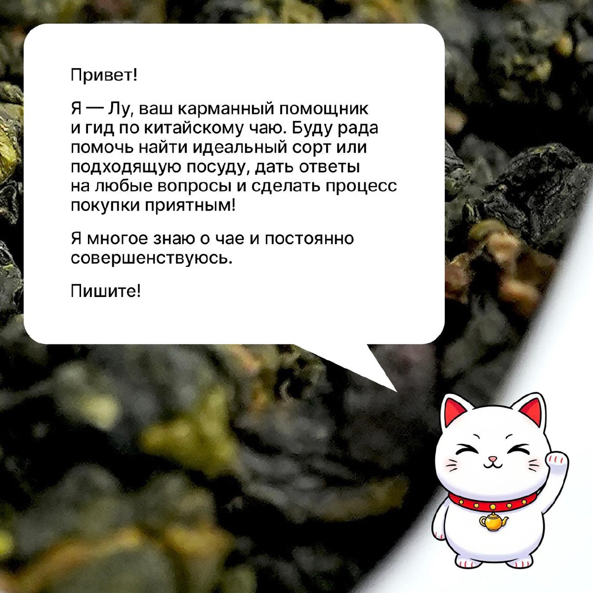 Лу даст ответ на любой ваш вопрос о китайском чае: как правильно заваривать тот или иной сорт, чем шу пуэр отличается от шен пуэра, какой чай расслабляет… ☺️ @hichaekbot