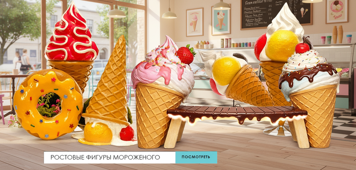 но скажут: «Там, где огромное мороженое». Фигура не уходит в отпуск, не устает и не требует зарплату. Ростовые фигуры мороженого и десертов отлично работают в: Фактическ