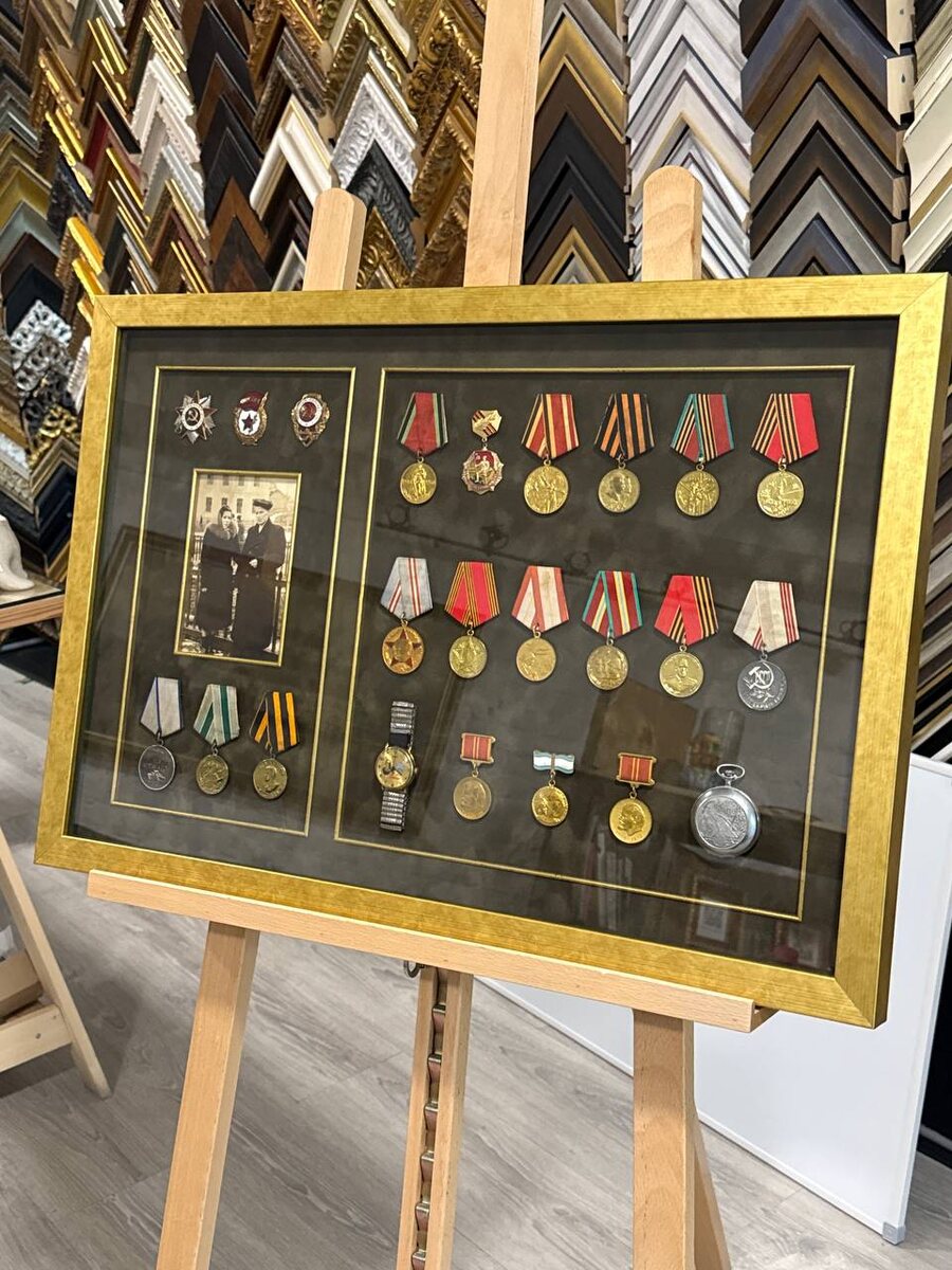 Моего деда звали Илья Сергеевич, бабушку — Нина Владимировна. Меня, как вы уже догадались, назвали в честь деда. Он ушёл на войну совсем мальчишкой. ❄️ Кольский полуостров — камни, холод, снег, постоянная передовая, бои за каждый метр и каждую сопку. Закончил войну в оккупации в Финляндии. Про войну говорить не любил. Помню, как однажды пристал к нему с вопросами: — Страшно было? — А ты как думаешь… конечно страшно. Историй было немного — про войну он рассказывал очень неохотно. И все они были жёсткие. 💪🏻 Среди наград — «За отвагу». Разведка боем. Пулемётчик. Я оформил всё в деревянную золотую коробку с паспарту цвета хаки, сектора отбил кантиком. В панно вошли медали, ордена, наградные юбилейные часы и его карманные — те самые, которые помню с самого раннего детства. На фото они с бабушкой ещё совсем молодые. Если у вас дома тоже лежат медали, фотографии или семейные реликвии — оформляйте. Такие вещи должны жить на стене, а не в коробках. Арт-мастерская «Багетъ» Москва, Дмитро