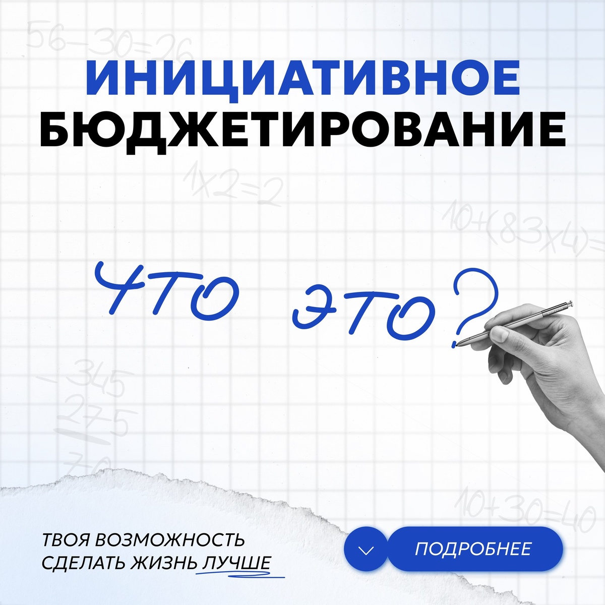 участвовать в распределении бюджетных средств на их решение. Граждане предлагают идеи (благоустройство, детские площадки, ремонт дорог), участвуют в их голосовании, софинансировании и контроле. Основные аспекты и особенности: Суть: Жители сами выбирают, что нужно улучшить, а власть выделяет на это бюджетные средства. Источники финансирования: Бюджетные субсидии (региональные/местные), обязательное софинансирование со стороны жителей, бизнеса или юридических лиц. Процесс: Включает выдвижение инициативы, конкурсный отбор, реализацию и общественный контроль. Цели: Вовлечение граждан в местное самоуправление, повышение эффективности расходов и решение актуальных проблем.