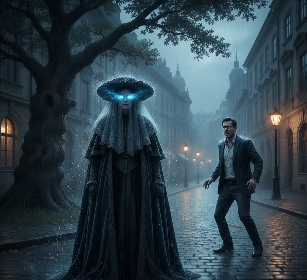 Под старым, скрюченным дубом стояла она. Её наряд — тяжелый бархатный плащ и шляпа с вуалью — казался неуместным артефактом из позапрошлого века. Но пугало другое: капли дождя облетали её стороной, словно натыкаясь на невидимый купол. Когда она подняла голову, я оцепенел. Её глаза не просто светились — это было пульсирующее лазурное пламя, в котором, казалось, отражались события, еще не успевшие произойти.