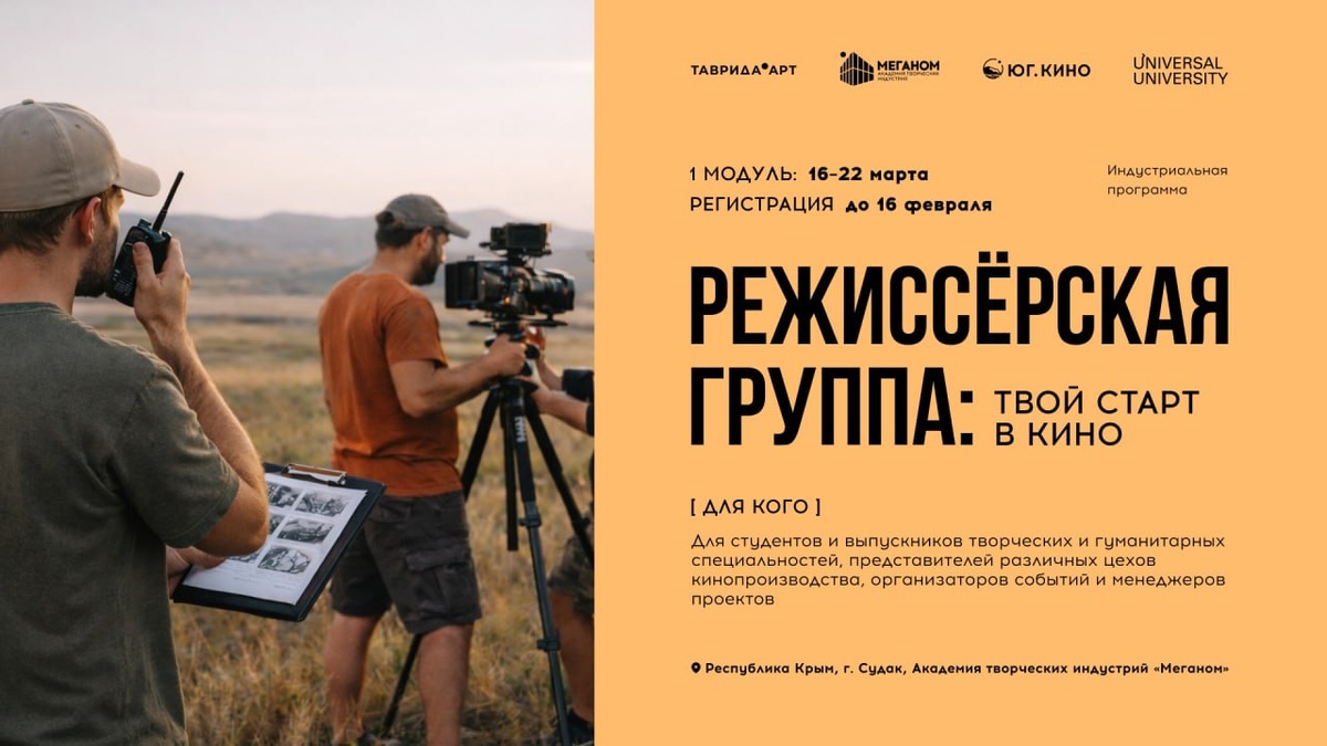 Здесь учат профессиям второго эшелона, без которых не работает ни одна съёмка: ⭕️помощник режиссёра, ⭕️ассистент режиссёра по актёрам, ⭕️бригадир актёров массовых сцен. Обучение ориентировано на реальную индустрию и практическую работу. На программе вы: 🎬 разберётесь, как устроена съёмочная площадка изнутри и какую роль в ней играет каждый; 📕 получите диплом государственного образца; 📋 сможете войти в шорт-лист специалистов, рекомендованных для сотрудничества с «Юг.Кино». Подать заявку можно до 16 февраля на сайте 🖇 Кино ближе, чем кажется 💫 #ТавридаАкадемия