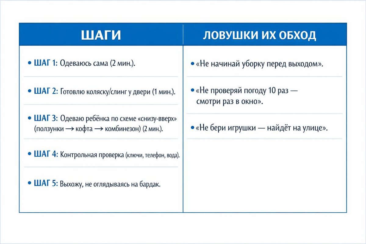 Раньше сборы растягивались на 20 минут и заканчивались истерикой (у меня). Пока я не разложила процесс на этапы. Вот моя схема, которая теперь висит у меня на холодильнике. Пользуйтесь!