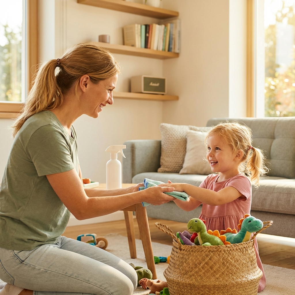 А теперь самый спорный момент быстрой уборки квартиры: стоит ли привлекать детей к процессу, когда счёт идёт на минуты? Короткий ответ — да, но с оговорками при экспресс уборке. Длинный ответ требует понимания возрастных возможностей при уборке дома. Трёхлетка не сложит плед идеально. Пятилетка промахнётся мимо корзины с игрушками. И это нормально для эффективной уборки с детьми. Цель не в безупречном результате, а в формировании привычки участвовать. Вот что могут делать дети разного возраста без замедления темпа быстрой уборки квартиры: 2-3 года: 4-5 лет: 6-8 лет: 9+ лет: Главный секрет эффективной уборки дома с детьми — давать задания до начала таймера. Не в процессе, когда вы уже несётесь по квартире с корзиной наперевес. Потратьте 30 секунд на инструктаж: «Пока мультик, ты собираешь всех динозавров в синий ящик. Справишься?» Формулировка имеет значение при быстрой уборке квартиры с детьми. «Убери игрушки» — слишком абстрактно. «Собери всех динозавров» — конкретно и выполнимо. Детс