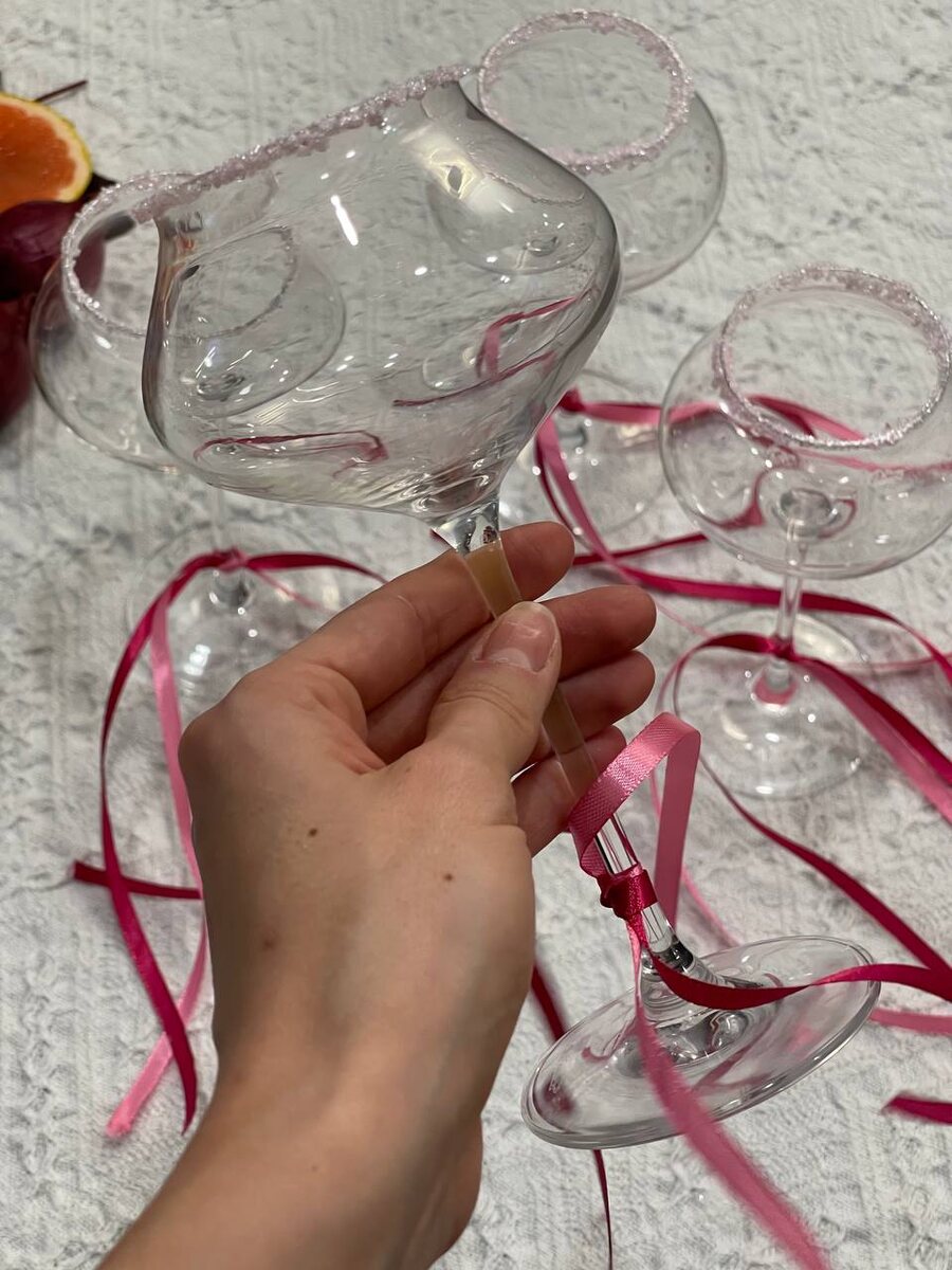 🍸 Часть 2: Бокалы Таким образом можно придать торжественный вид любому бокалу: 🍸 смешать сахар (или сахарозаменитель) или соль с блестками нужного цвета и пройтись по краям 🍸добавить ленты в цвет (можно оставить их длинными, а можно сделать банты или плотно обмотать ножку) 🍸взять металлические шпажки для коктейлей и нанизать на них мармелад. Он будет отлично сочетаться с любыми напитками Как по мне, таким бокалам отлично подойдет обычная белая скатерть. Которую очень хорошо украсят закуски. О них в следующих сериях 💗 #домашнийресторангедонизма #розовыйсуаре