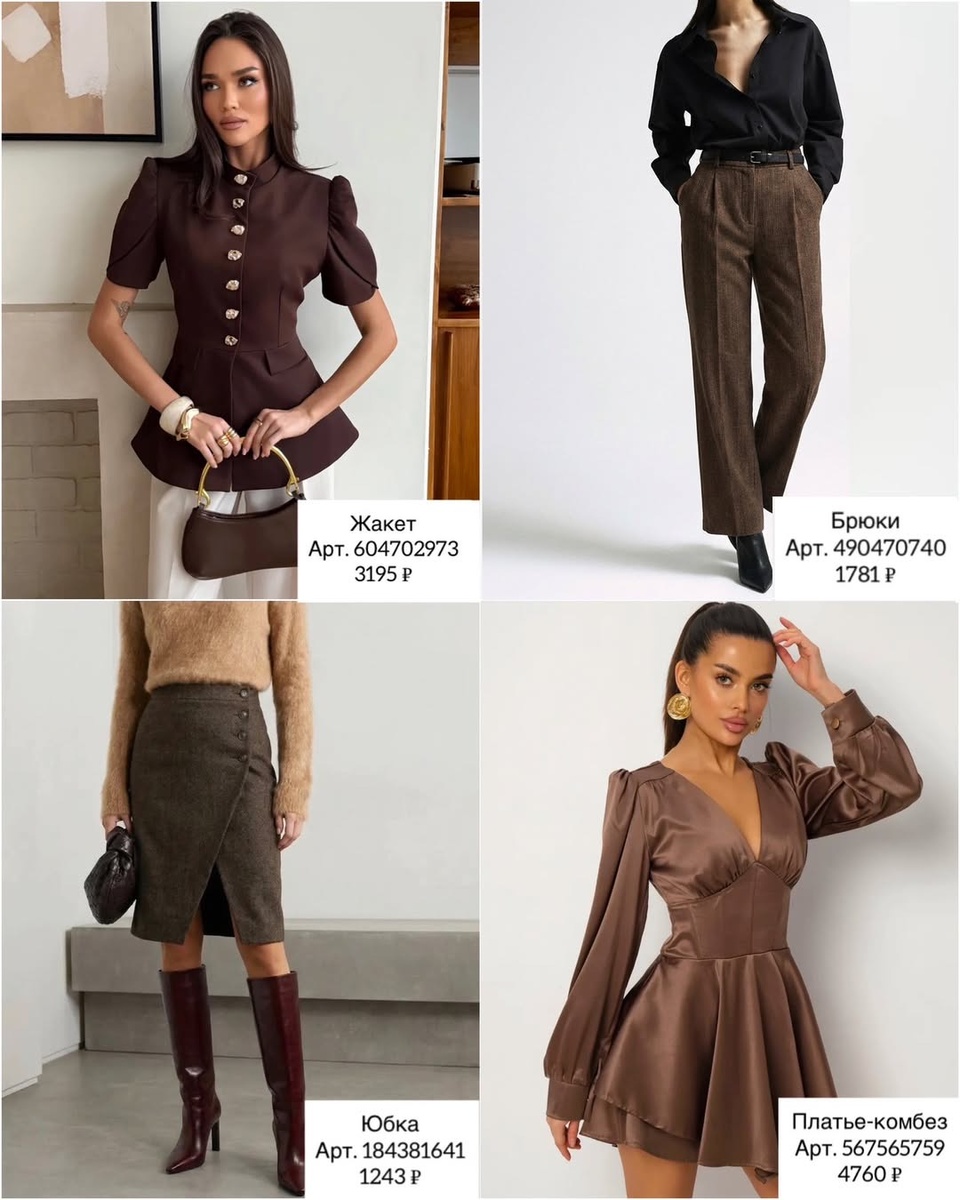 Эта подборка — готовый конструктор, где каждая вещь усиливает другую. Жакеты дают архитектуру и талию, брюки отвечают за базу и комфорт, юбки добавляют женственность, а платье-комбез закрывает вопрос «что надеть на выход» одним движением. В коричневой гамме всё это выглядит особенно благородно: оттенки «собирают» образ, а фактуры делают его глубже и интереснее.