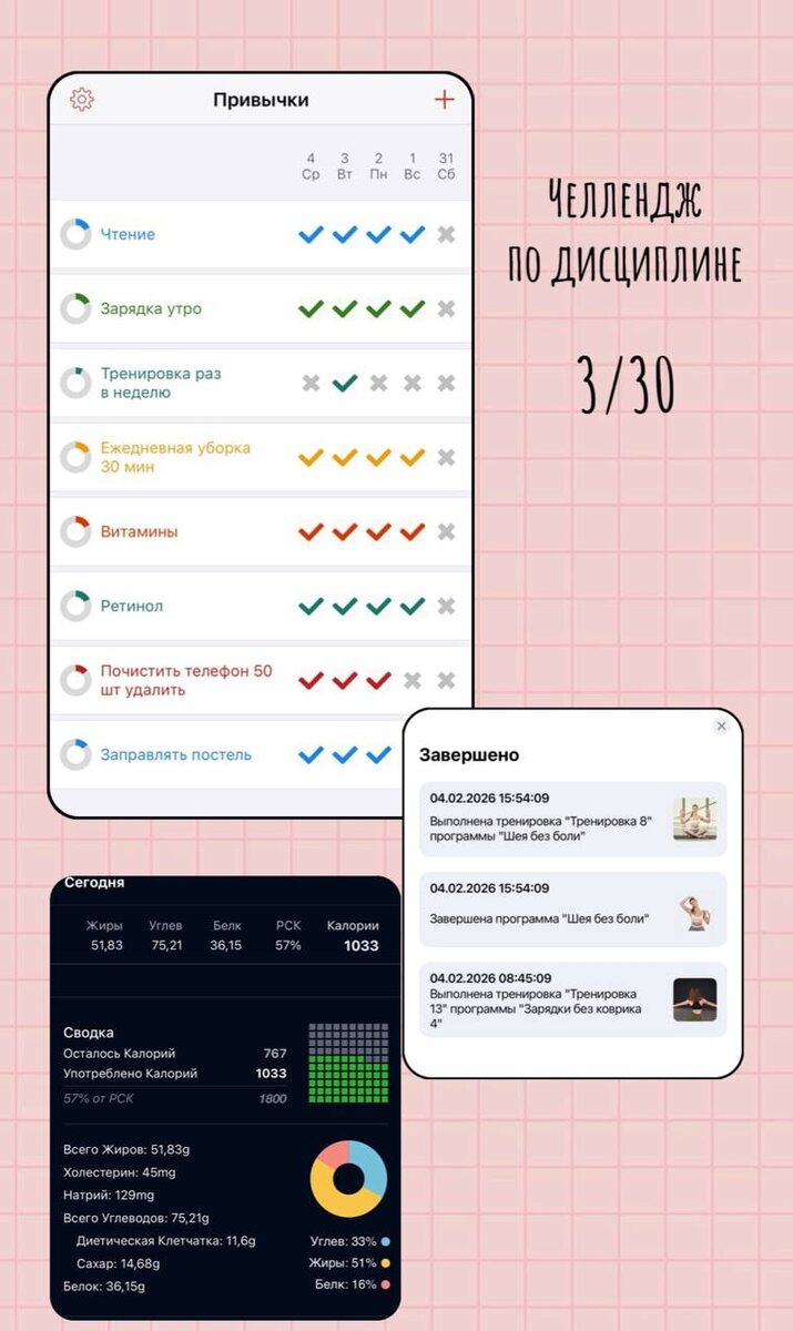 #челлендж спорт ✅ закончила тренировки "шея без боли" + утренняя зарядка завтра хочу попробовать начать фейсфитнес Правильное питание и витаминки✅ по калориям чутка не добрала, думаю еще съем что-то внезапно для себя обнаружила вкусненькое сочетание: гречневые хлебцы от корнер и икру трески (по калориям тоже немного выходит) Саморазвитие и ежедневник ✅ продолжаю читать книгу «полный порядок» готова поделиться своими мыслями, уже догнала что пропустила и продолжаю вести ежедневник по самооценке Уход ✅ - ретинол, уже пишу пост про уход за лицом